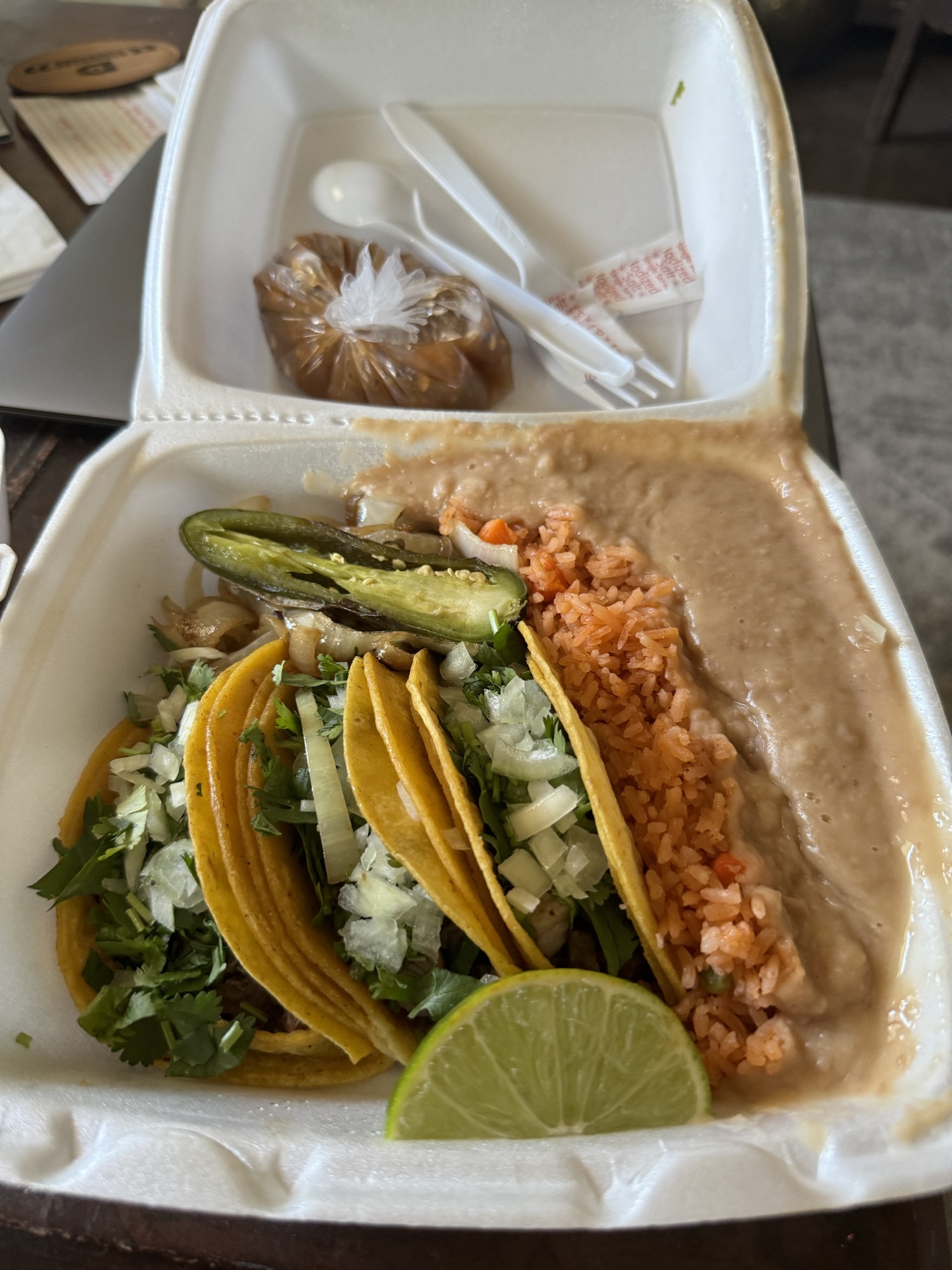 Review: To-go only. Hole-in-the-wall on Forth Worth Ave. Solid meats, good Gordita. Another place that puts their salsa in plastic bags… kind of odd! Overall worth a stop.