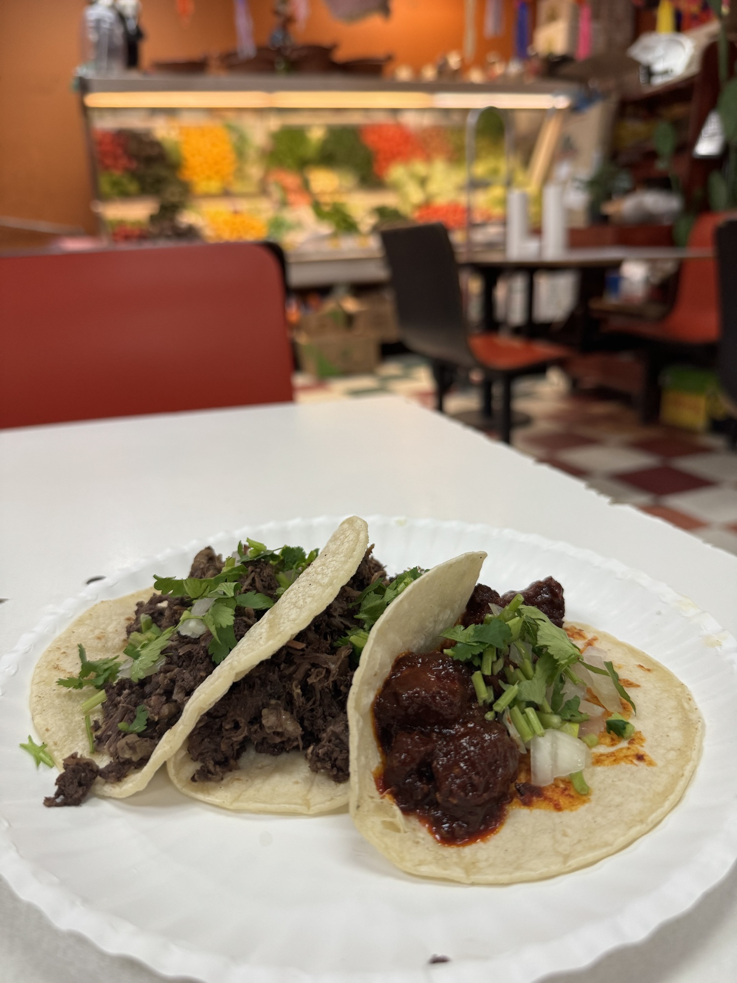 Review: This was a little lunch counter kind of place in the back of a small meat-market grocer. There were chickens wandering the parking lots and people going in and out. I had to check it out. Overall they had decent meat, but no salsa options. There was a little area to add onion and cilantro.