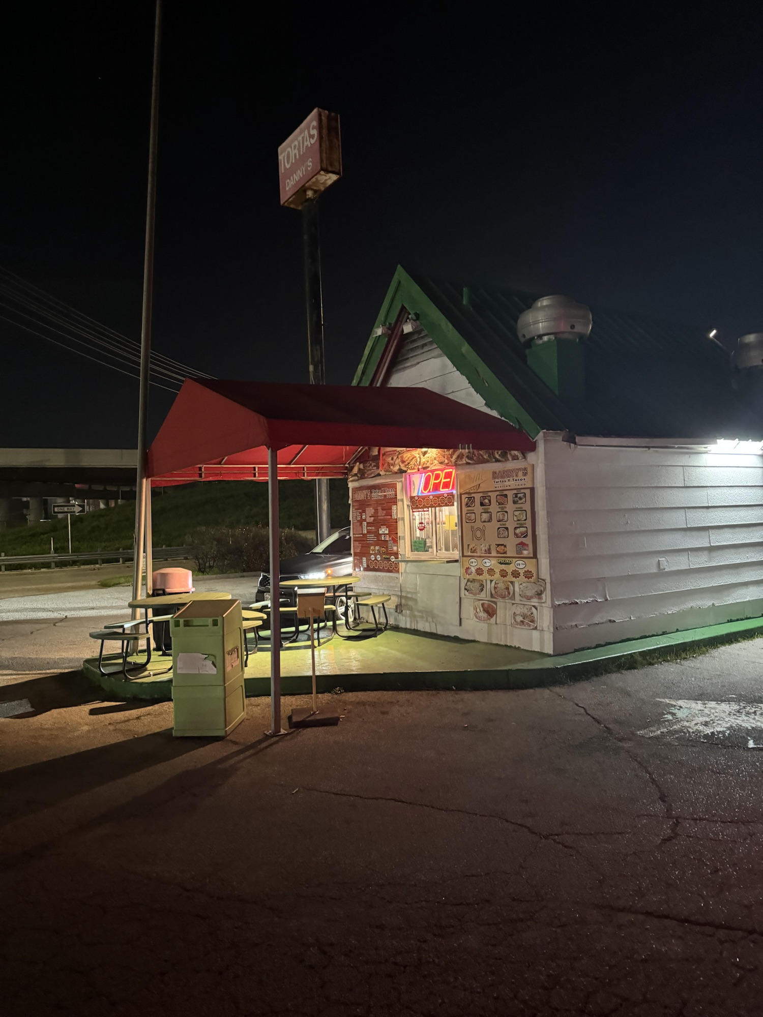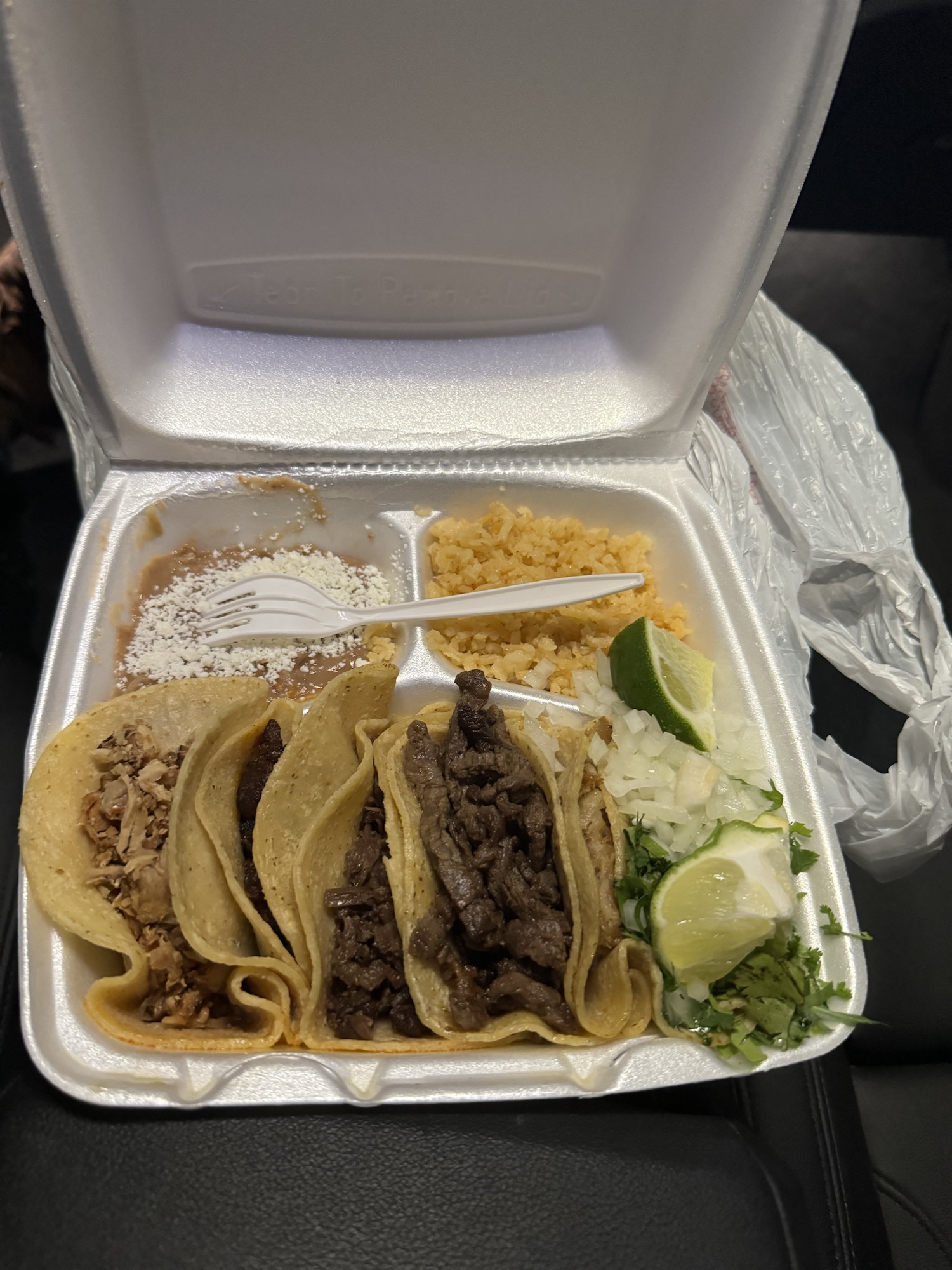 Review: This is a little taco stand right next to the highway. They’re open late with a drive thru. I stopped by for some late night food on my way to an event. Overall the food was OK. I thought the meat was kind of dry and the tortillas were greasy (which is what some people like). Not bad for a small late night spot.