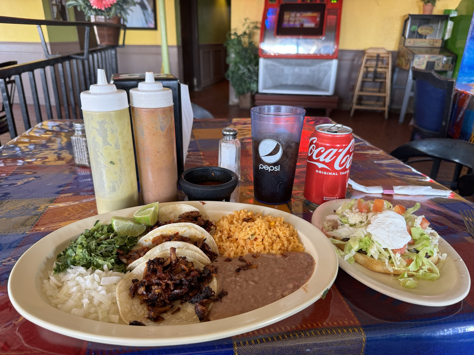 Review: I got their taco lunch special — 3 tacos + beans & rice. You could only choose one meat, so I went with al pastor. It was crispy and delicious. The corn tortillas were fairly standard, not homemade. I also ordered a barbacoa sope. It was solid, but not as crunch as I would have liked. Both red and green salsas were quite good; I enjoyed the flavor and spice!