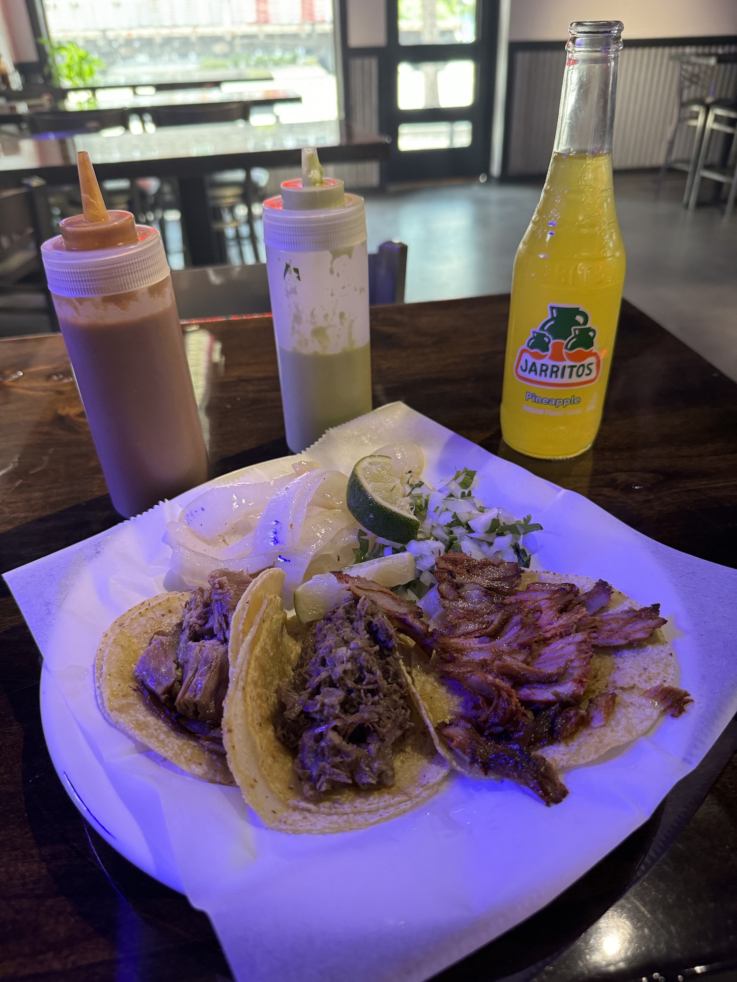 Review: This is a new-ish bar/restaurant on Singleton. I went in the middle of the afternoon so it was pretty empty. I ordered trompo, carnitas, barbacoa tacos. The meat were all very good. I enjoyed the crisp and thinly sliced trompo. The barbacoa and carnitas both had nice flavor too. The red and green salsa were great with a good amount of spice. They came on your standard corn tortillas.