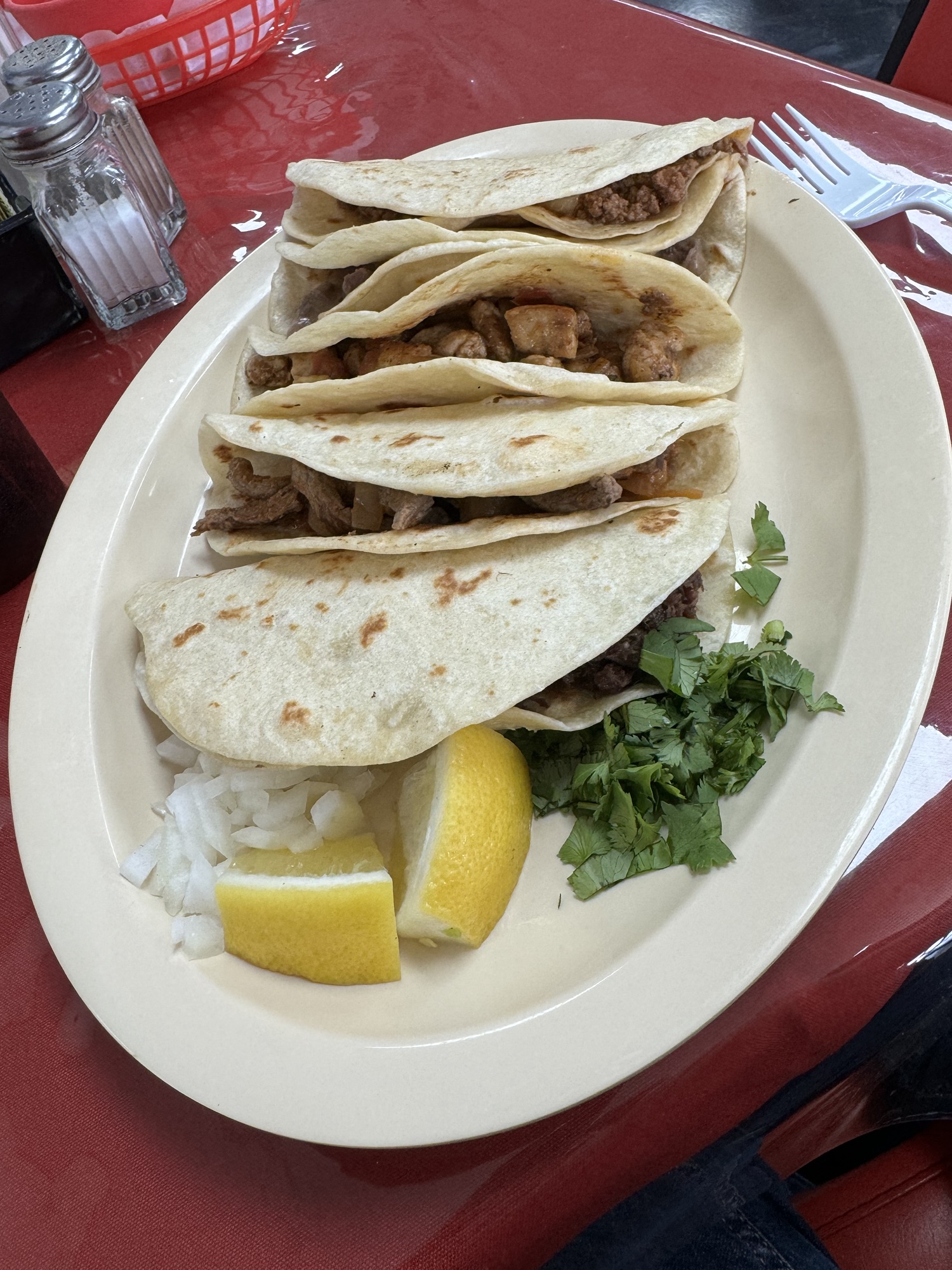 Review: I was super hungry looking for tacos, and found this spot. I ordered 5 tacos, each with a different meat/filling. I decided to try some new stuff. I went with beef guiso, pork guiso, picadillo, steak ranchero, and barbacoa. They game in really really good homemade flour tortillas, but no real salsa and minimal cilantro onion. This was a little disappointing but I’m glad I got out of my comfort zone and tried some new things.