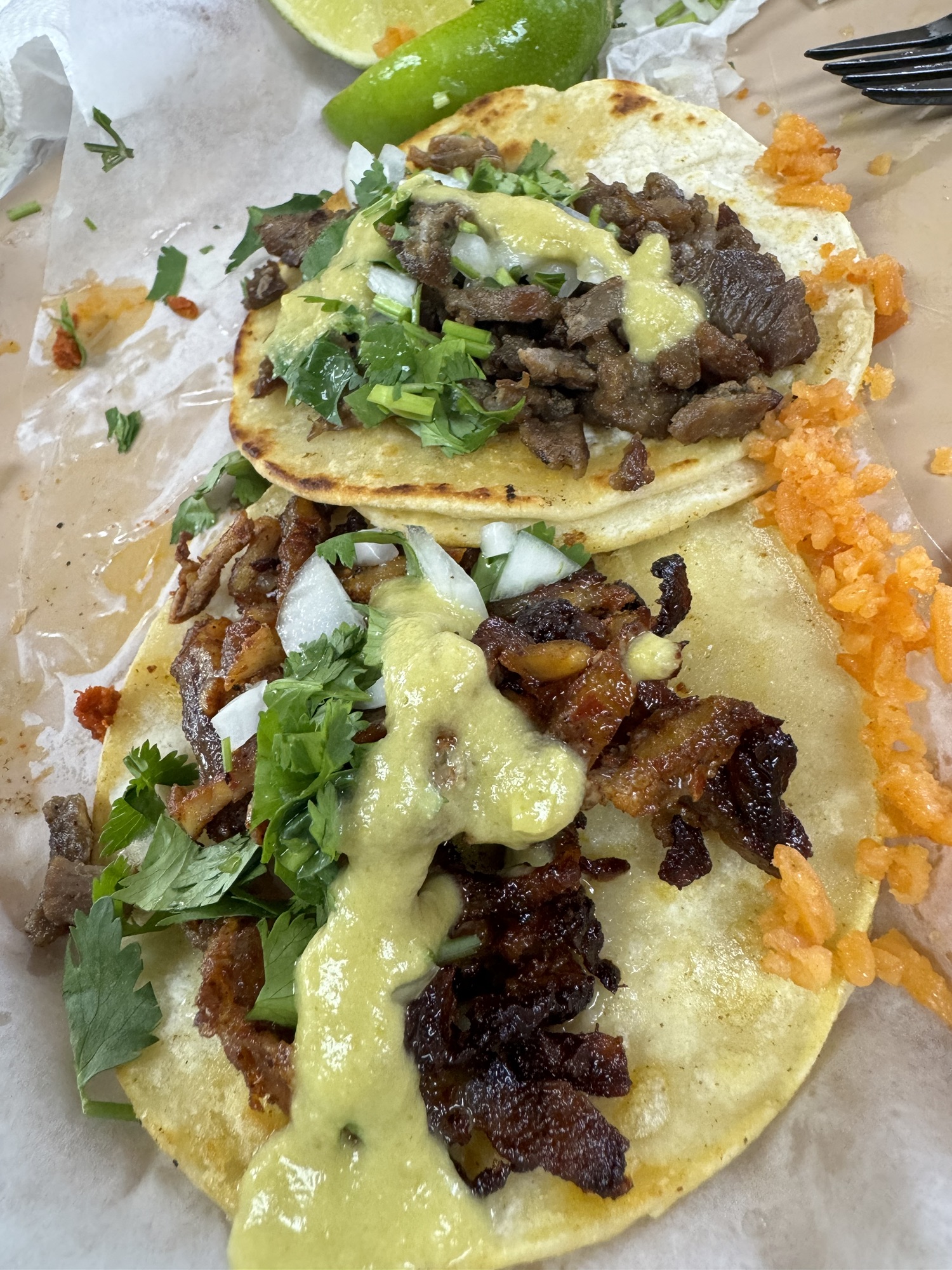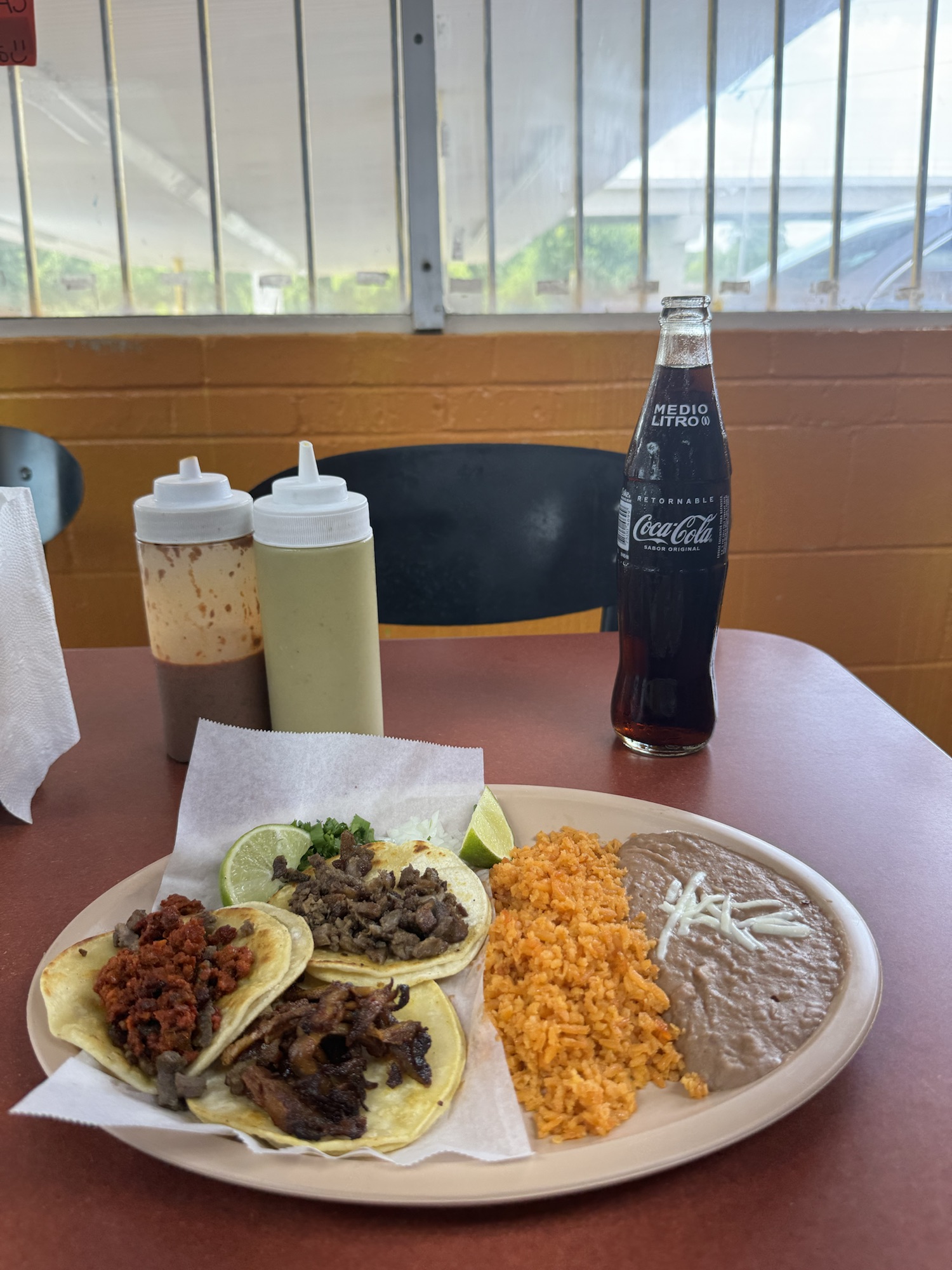 Review: I loved the vibes of this spot. It’s in an old drive-in, bright orange, off of a dusty road near dart tracks. Felt like a road side oasis. The food was really good, but my rating may be inflated because I was super hungry following my Sunday long run. I got pastor and bistec tacos, and a champenchana taco as a part of the taco plate special. The tortillas were really good. I don’t think they were homemade, but the cooked them well so they had a nice crispness to them. The meats were also well-cooked and seasoned. I enjoyed the green salsa too; good spice. Didn’t try the red.