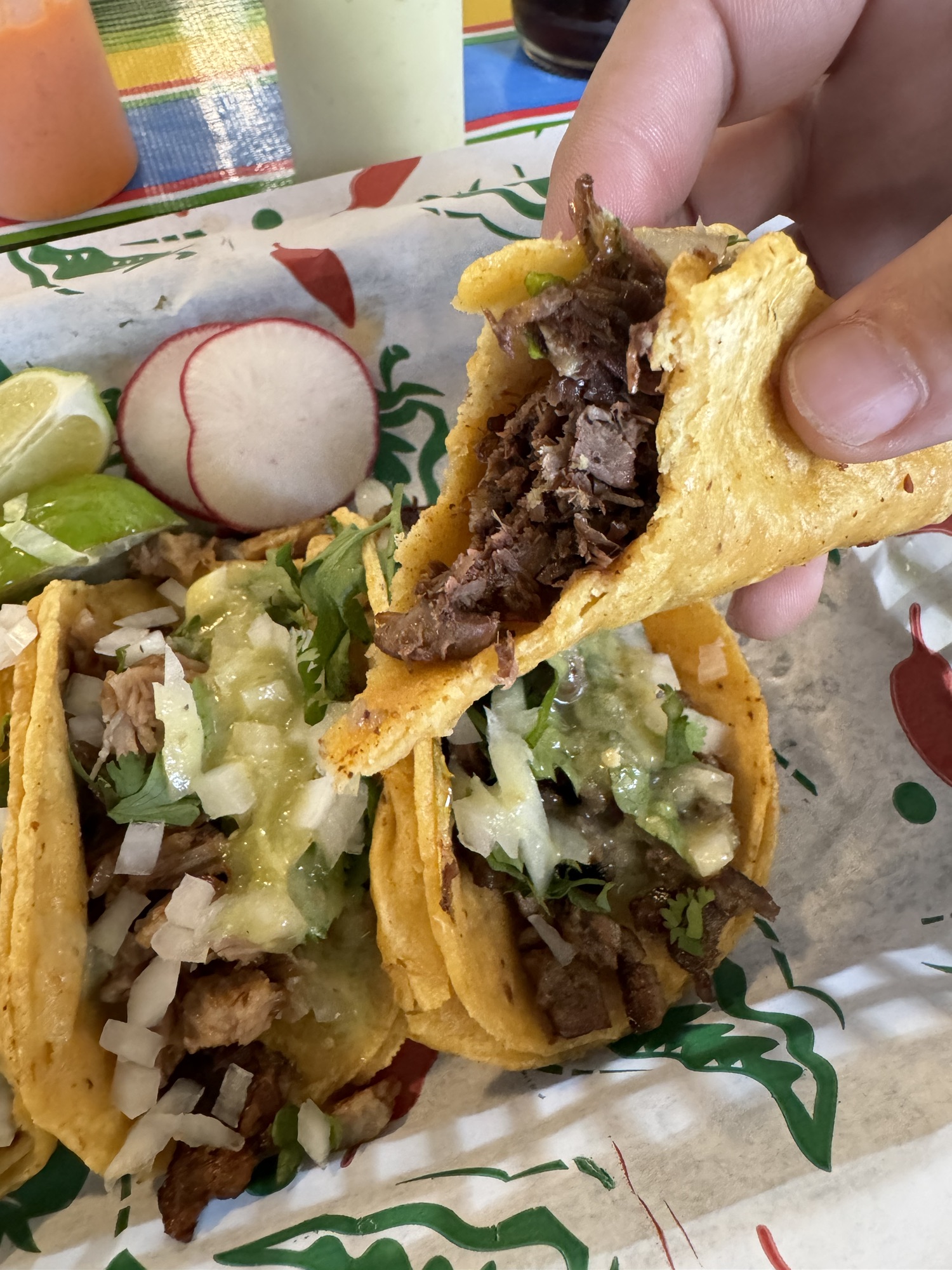 Review: Note: this place is cash only! I’d driven by this spot a couple times. Almost went the other day but did not have cash. This definitely definitely has hole-in-the-wall vibes. Super friendly service, however. I really enjoyed their salsas. They had a red and two green options. I enjoyed them all. Solid small homemade corn tortillas; thick enough to hold up to the heavy of the meat and onion/cilantro. All of the meats were fresh and warm, and really tasted great with the salsa and tortillas. Everything was very flavorful. They tacos also came with radishes as a garnish, which is a sign of damn good Mexican food for me.
