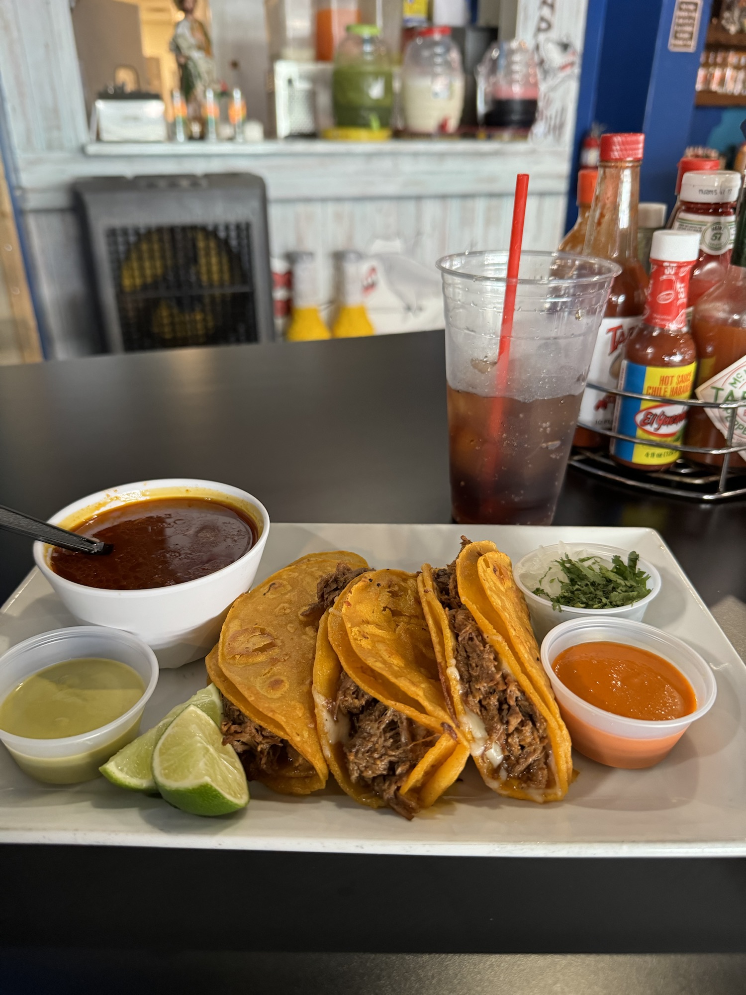 Review: This is mostly a seafood place but they advertise having some of the best birria tacos in Dallas, so I had to try them. They were pretty solid. Good salsa and a great dipping sauce. The tortillas were delicious and contained a layer of cheese between them. The meat was tasty too and not overpowering. Sometimes I find birria tacos to be too rich or greasy, didn’t have that problem here (sure greasy but no over the top). They also had seafood, carne asada, and pollo taco options.