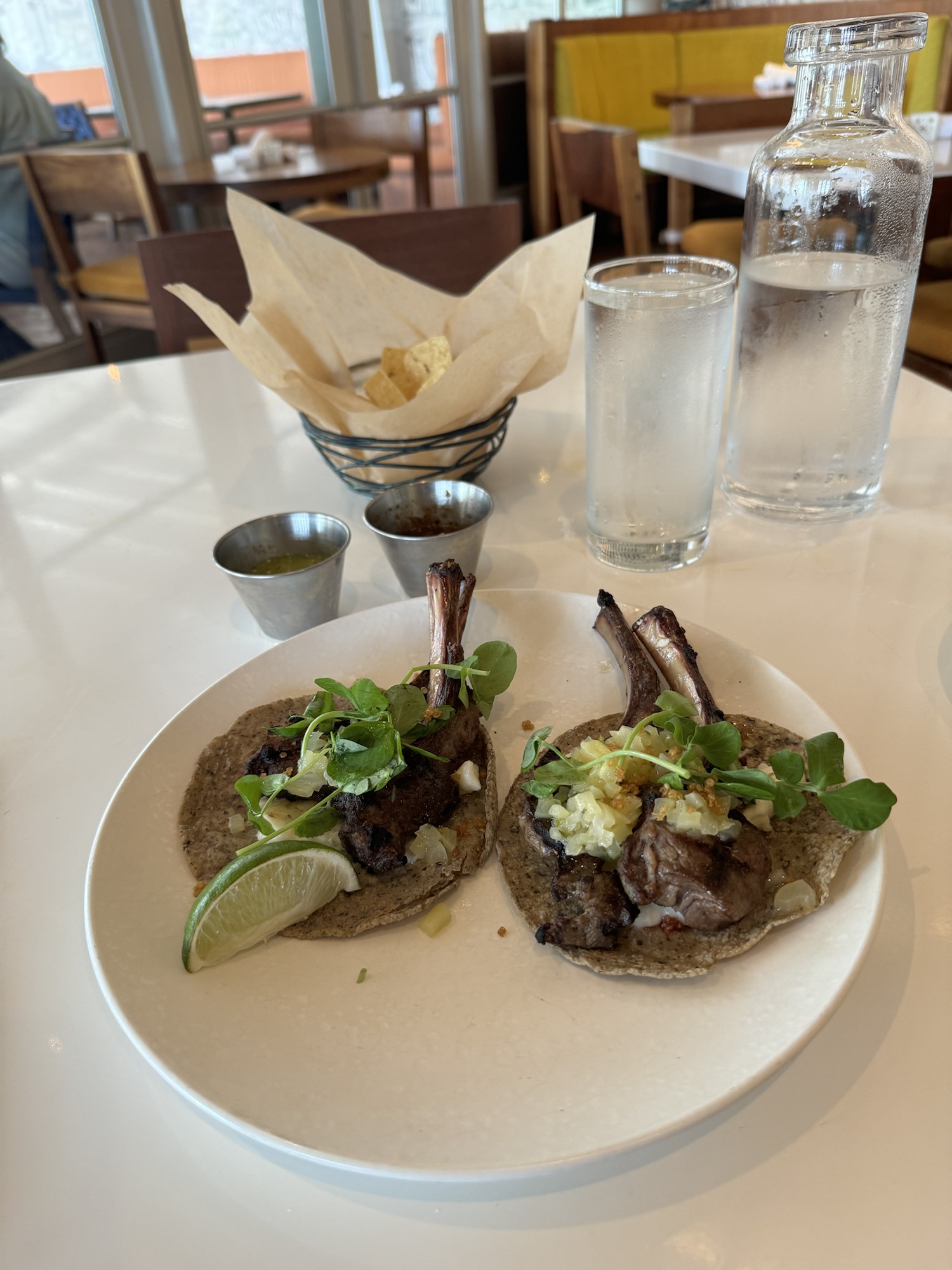 I ordered the “Tacos De Tacha,” which is a rotating chef’s special. It comes with a protein not found among the regular selection (which are fish, skirt steak, shrimp, and Lion’s Mane mushrooms) placed in a uniquely flavored hand-made masa tortilla. I couldn’t tell you all of the details of the specific tortillas I had, I think they included quinoa and grits (maybe) but they were tasty. The mean was on-the-bone lamb chops (two per tacos). It made it a bit challenging to eat. The waiter suggested holding the bones while biting, but I opted to cut the meat off the bone. Either way, it was amazing. The green salsa for the chips and salsa served along side the meal was very good too. Definitely worth a visit!