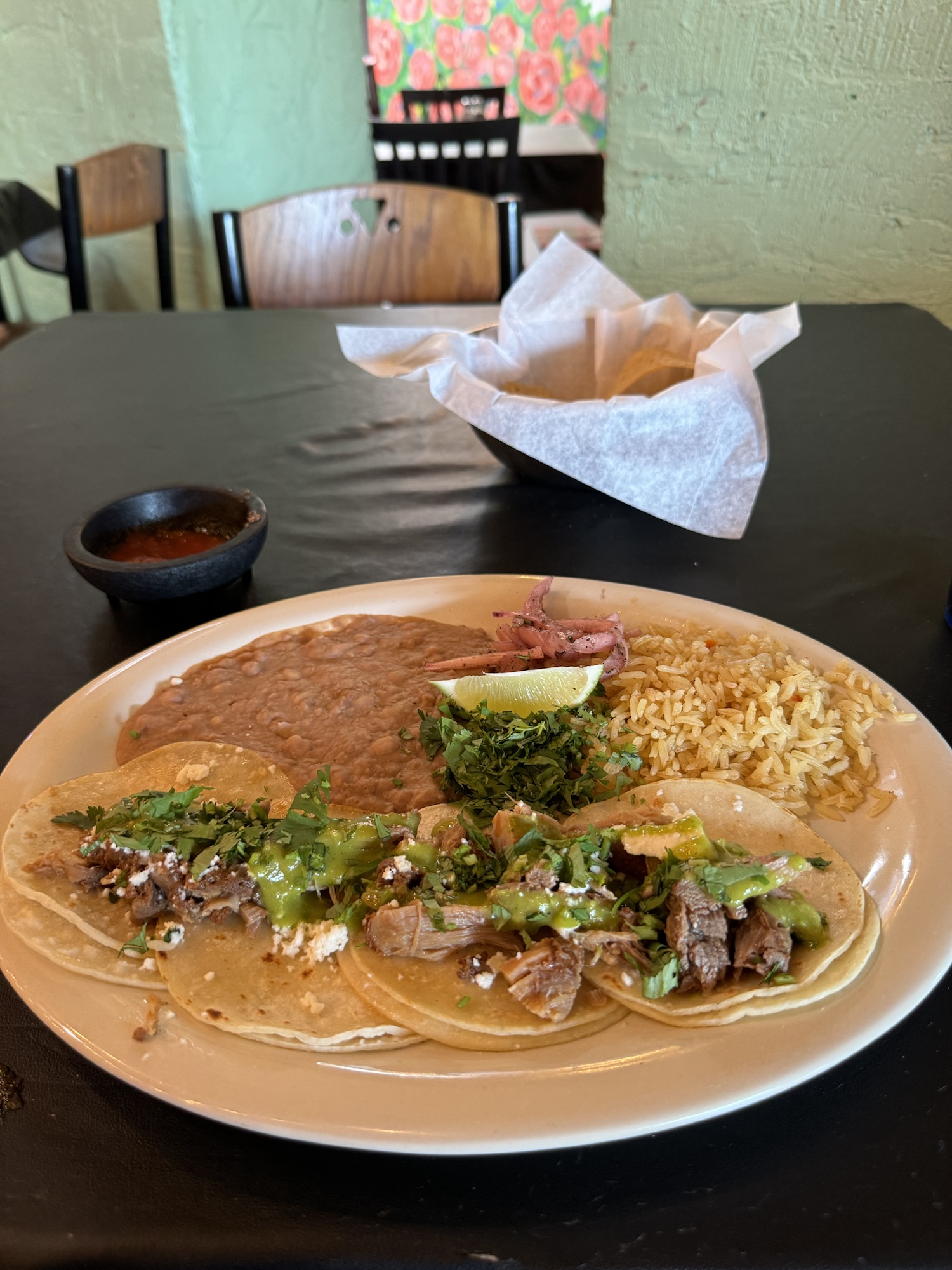 Review: Guy Fieri visited this place, so I had to as well. I chose not to get the same dish that he highlighted on Diner, Drive-ins, and Dives. Instead, I ordered the Street Style Pork Carnita Tacos. You ordered tacos by the plate rather than selecting and mix-matching meats option. The meat and flavors were really good meat. I was bummed that they didn’t have any hot sauce, and I don’t think the tortillas were homemade. It’s in Deep Ellum, and a bit more Tex-Mex than what I usually go for, but a quality place for a good meal.