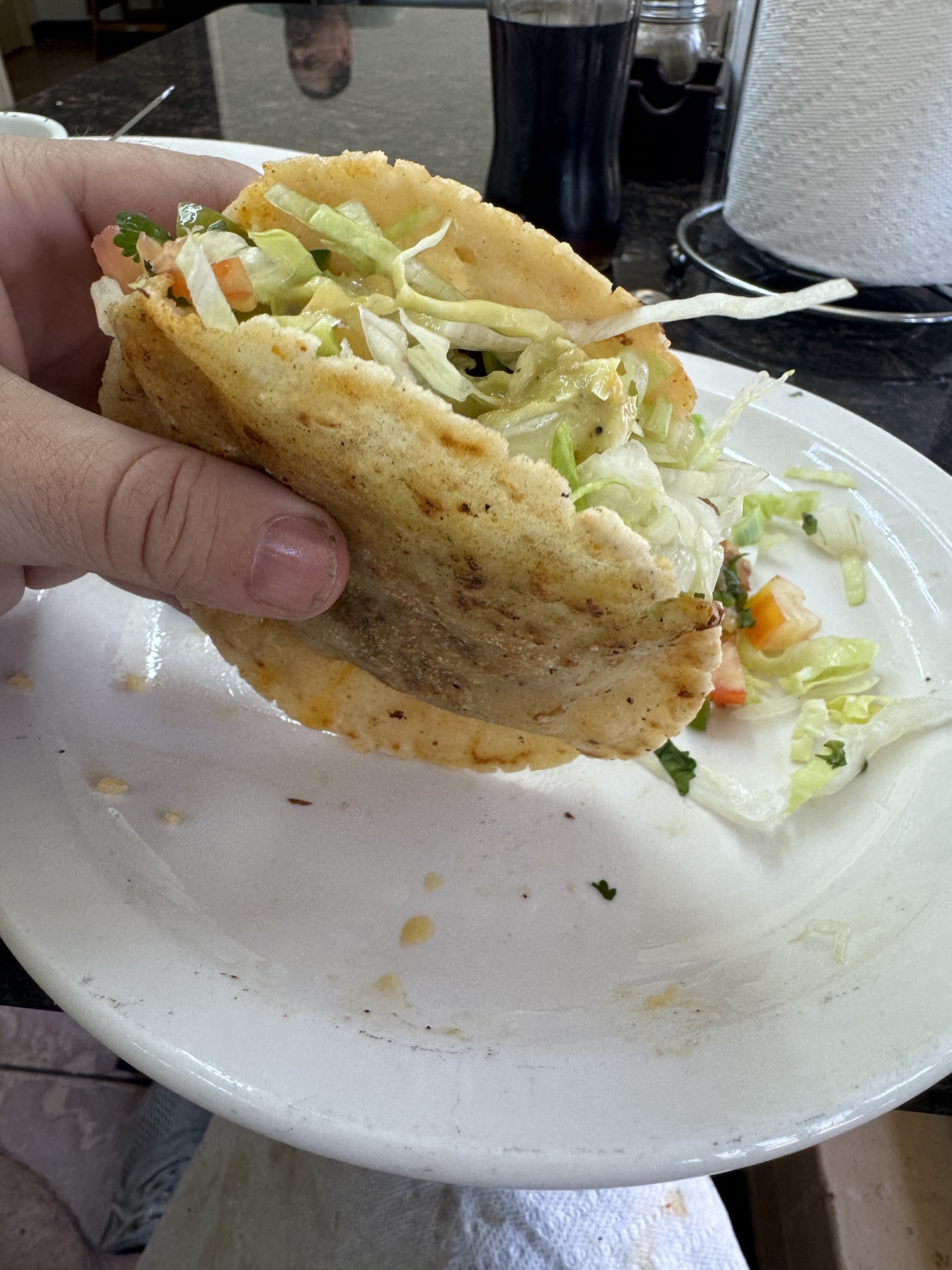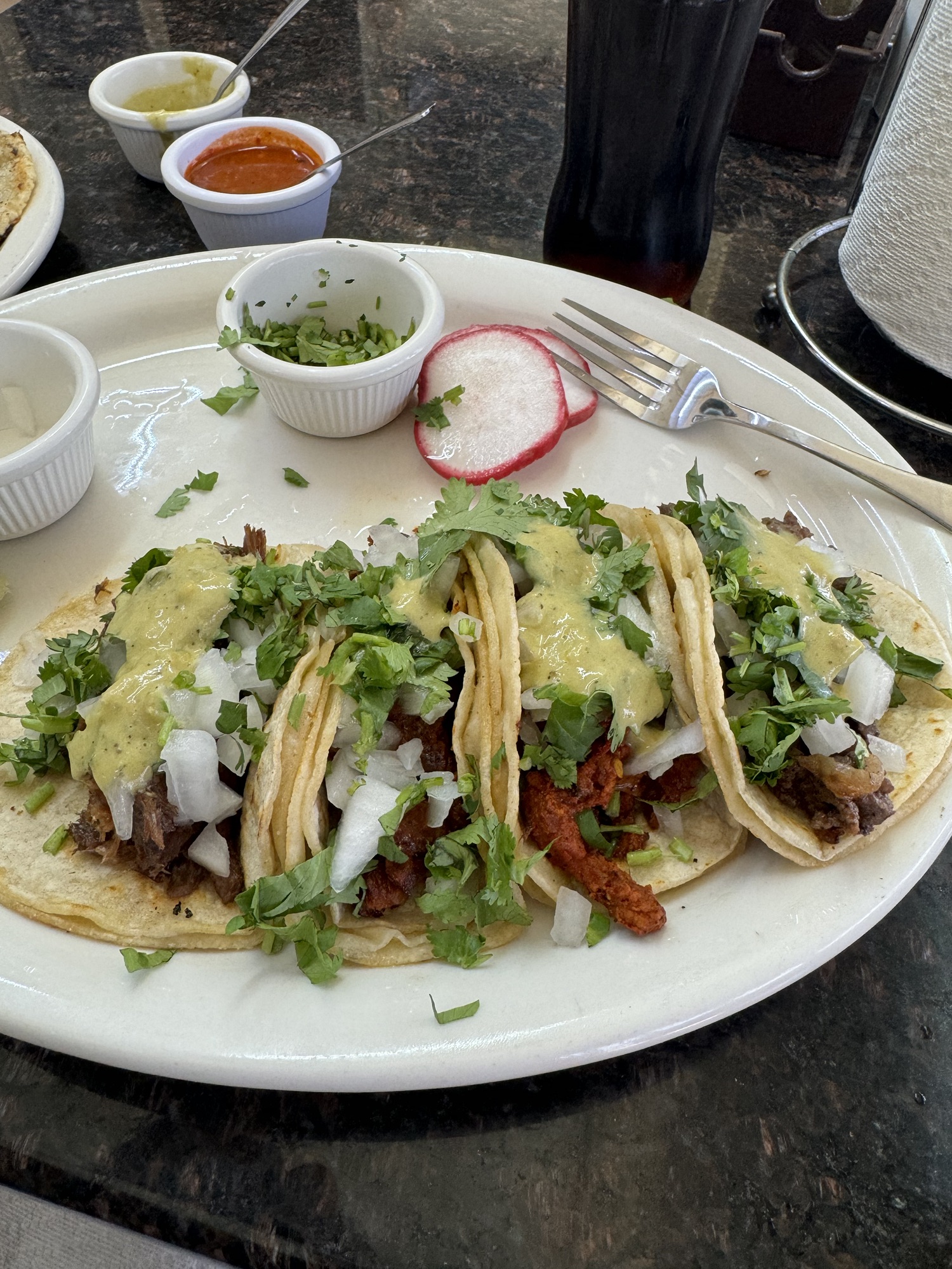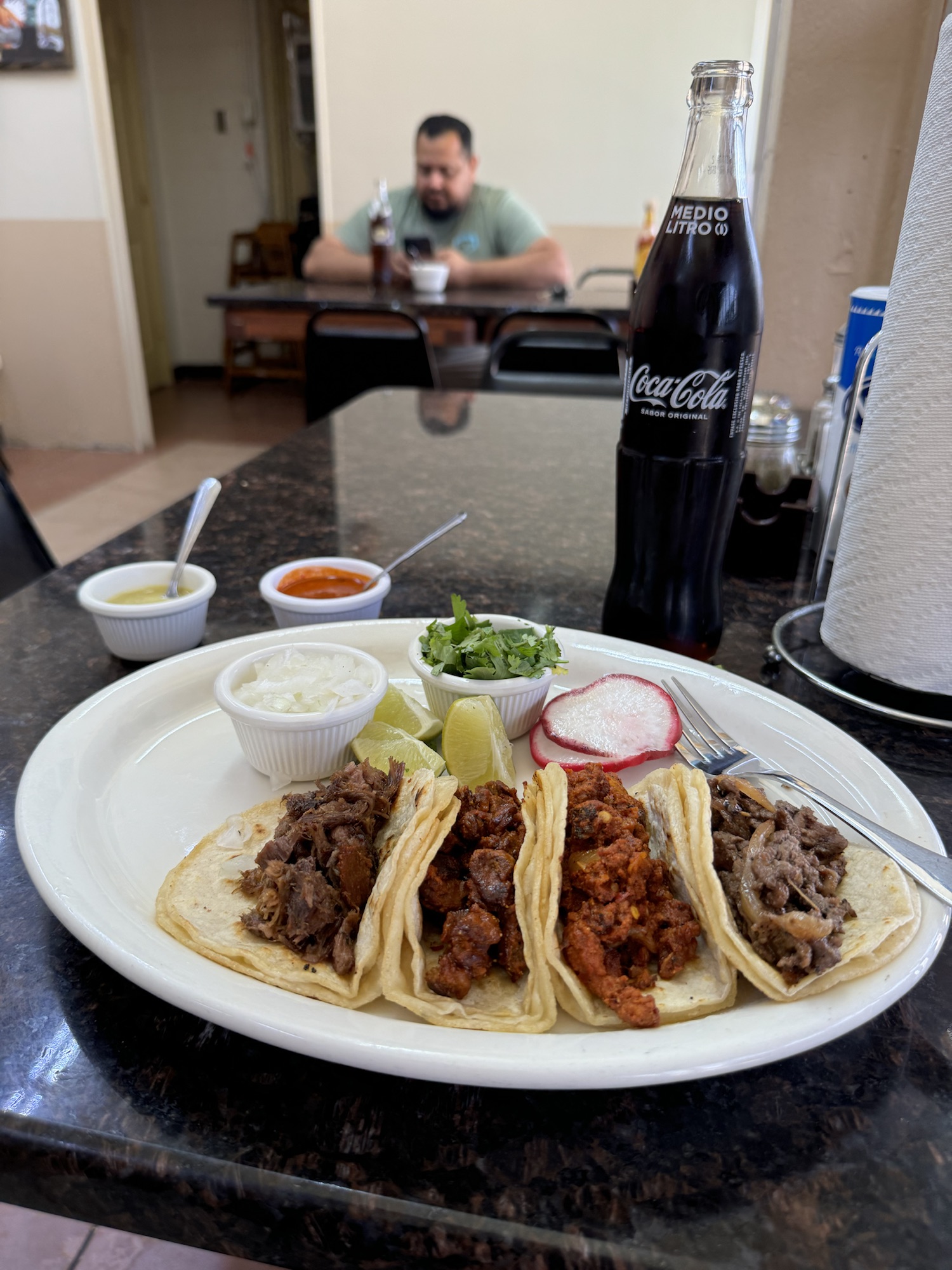 Review: My favorite thing about eating tacos every day is finding hidden gems like this spot. It’s a very unassuming building with a mural advertising their specials and barbacoa. Inside is small… maybe 6 tables and there are bars on the windows. It passes the hole-in-the-wall vibe check. Atmosphere is one thing, tasty food is another. This place has both. They note their lamb (or borrego) barbacoa on their sign. It is fantastic.