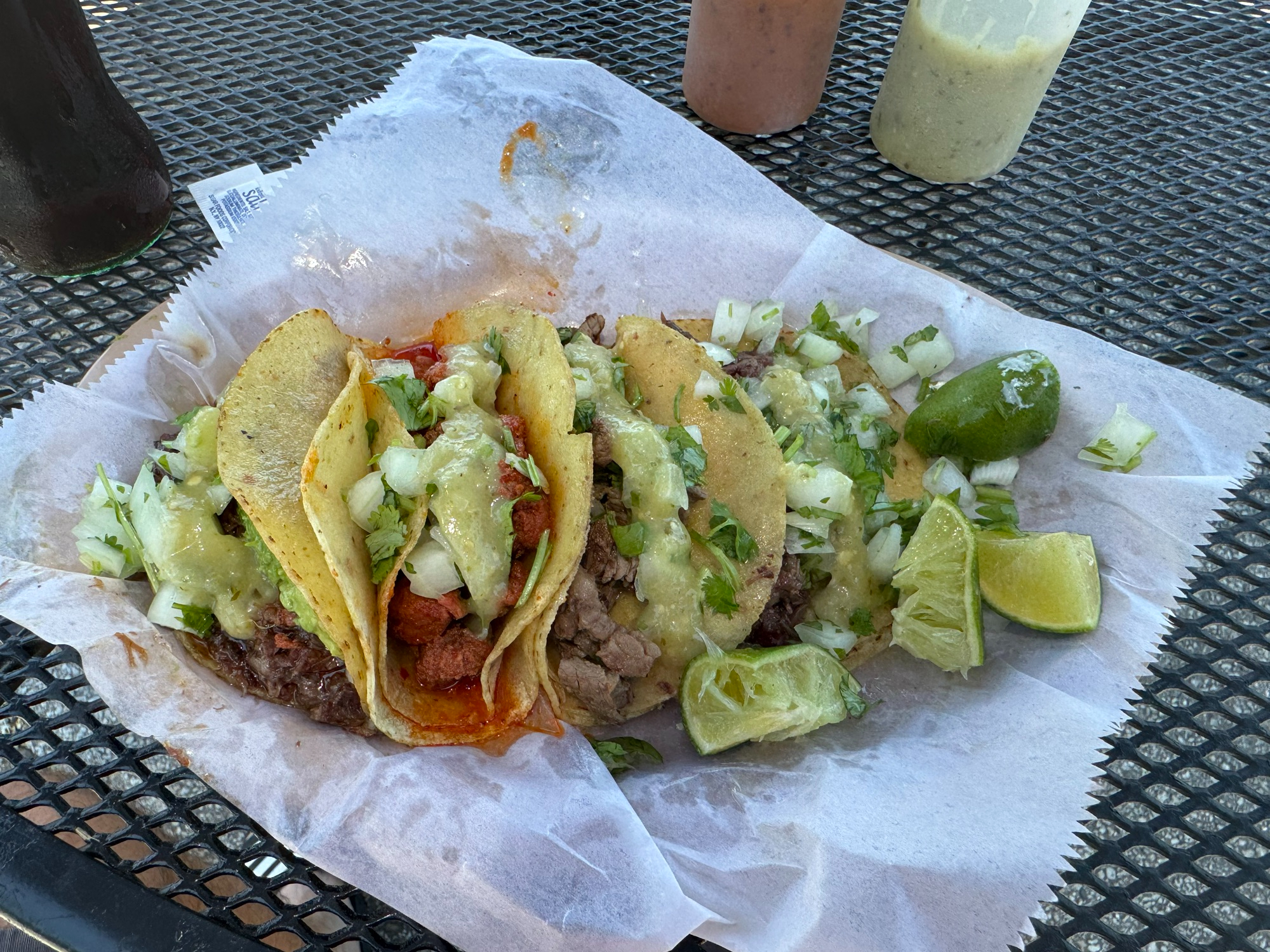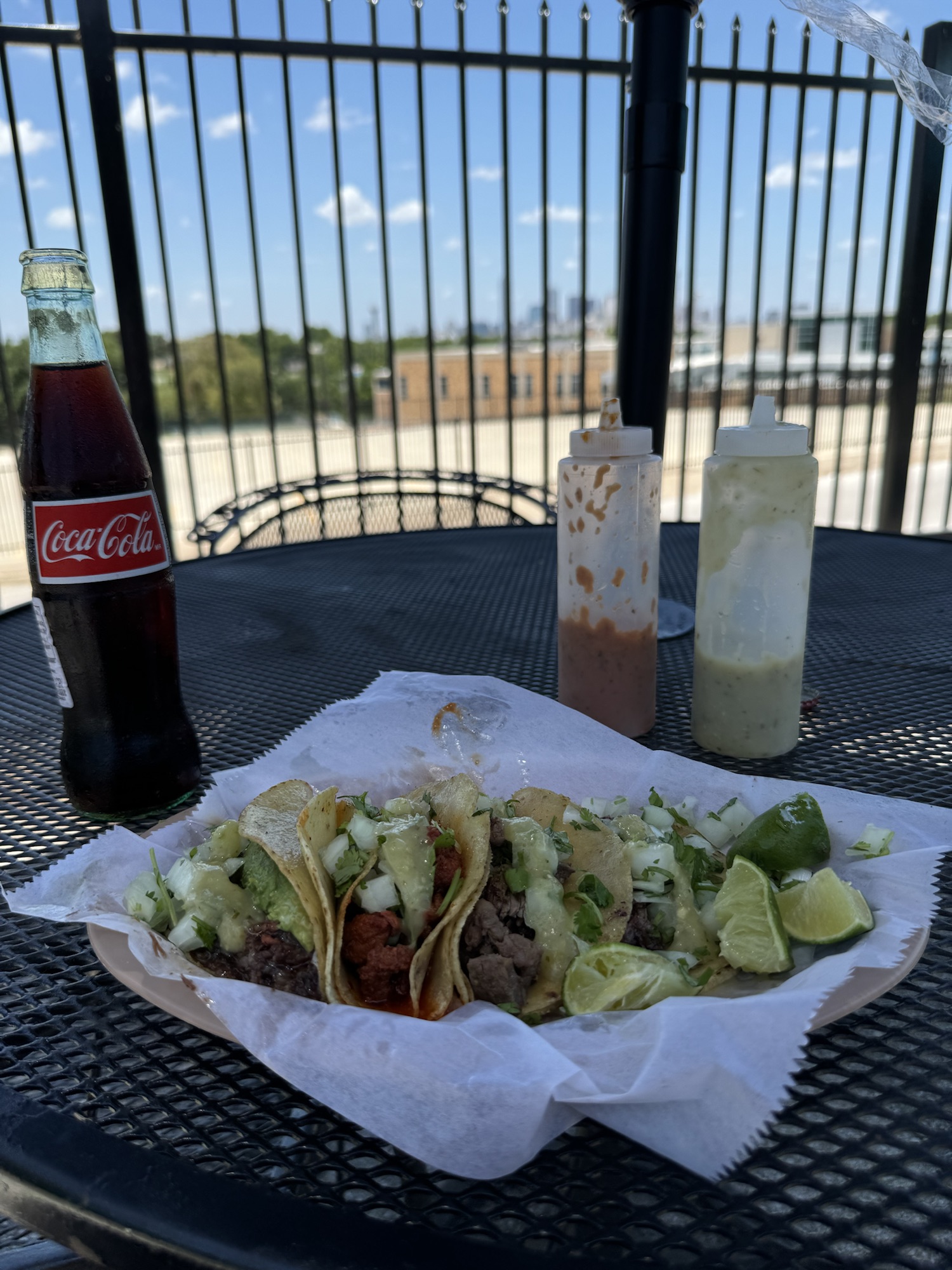 Review: This is a relatively new taco truck located in a hill in a parking lot across from Franklin Roosevelt high school in Oak Cliff. On Instagram, they advertise their amazing downtown views and ideal setting for night hangs (and holiday fireworks). Next to the taco truck there is seating with umbrellas for shade. I tried a few meats, going with barbacoa, pastor, bistec on corn tortillas, plus one their special tacos. The special tacos comes with melted cheese, avocado and your choice of meat (barbacoa for me). You get both red and green salsa, which are solid with some spice. The meat was flavorful but everything (including the tortillas) was a bit oily. That’s typical for a lot of street-style tacos so nothing to complain about. Overall a nice place with good food and an incredible view.