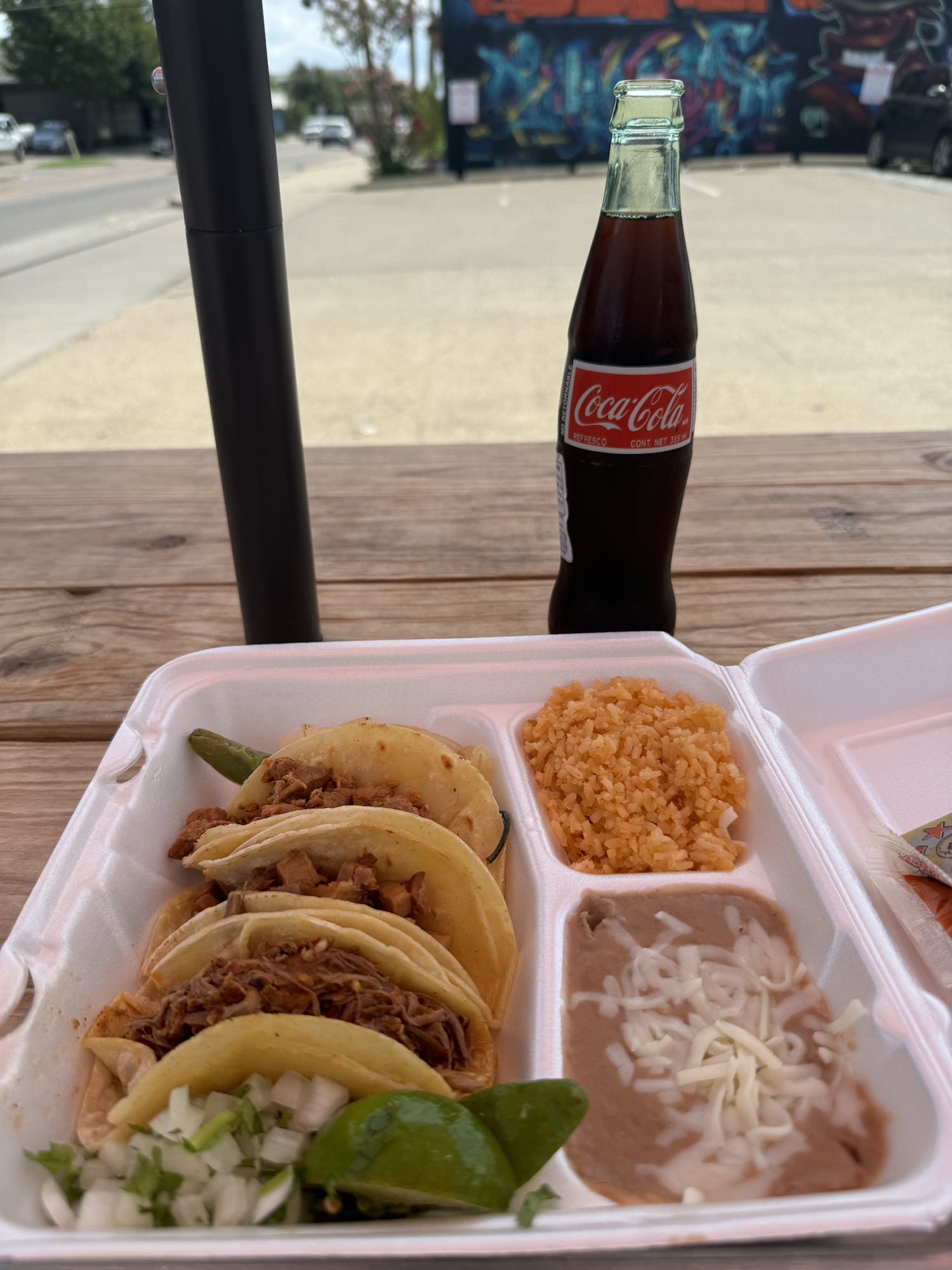 Review: They’ve got a few locations around DFW, but the one in Bishop Arts only recently opened. I ordered the taco plate with carnitas, pastor, and lamb birria. The birria was super good. The other meats were OK too. The tortillas had a decent cook to them. The salsa was pretty good but came in weird plastic pouches.