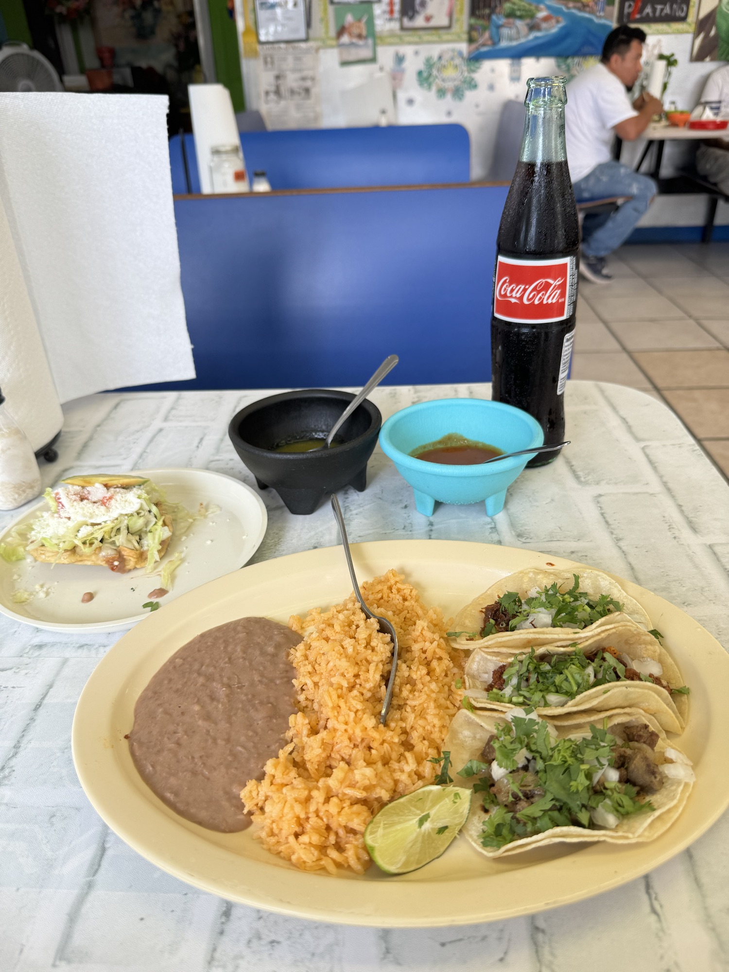 Review: I really liked this place. It has awesome hole-in-the-wall vibes and good food. They had a lot of plants and paintings and art work. I got a taco plate with pastor, fajita, and barbacoa + a sope with barbacoa. The tortillas were cooked really well. The pastor was my favorite of the meats, but the barbacoa was quite good too. The sope had decent crunch to it. I loved the salsa. They gave you two bowls, one red and one green. The green had a really nice spice to it.