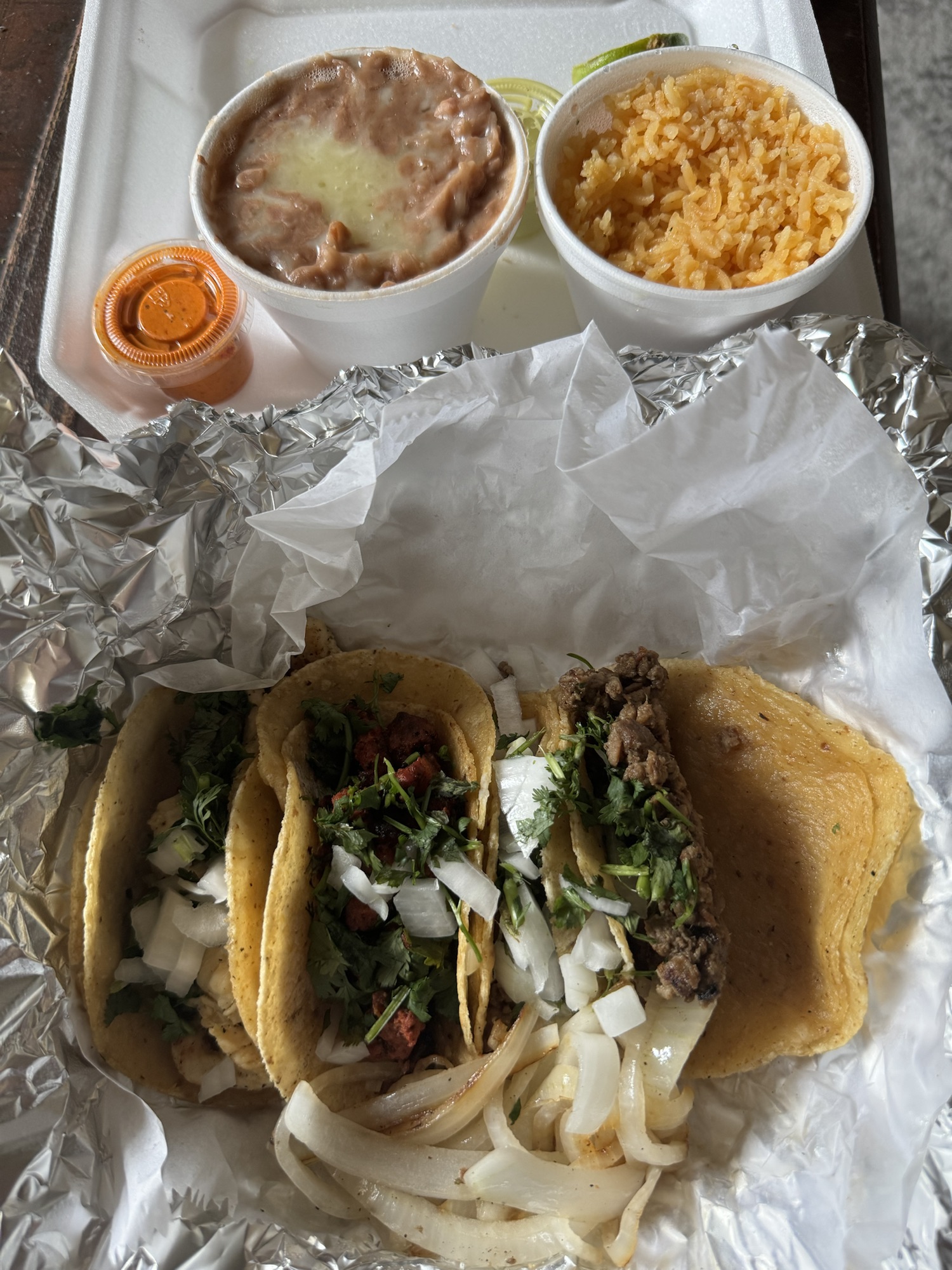 Review: This place was in a weird bus terminal thing. They had really solid spicy red salsa and decent green salsa. I got fajita, carne asada, pastor, and pollo. They varied from decent to good meats – fajita and carne asada were best. OK corn tortillas, a little over cooked.