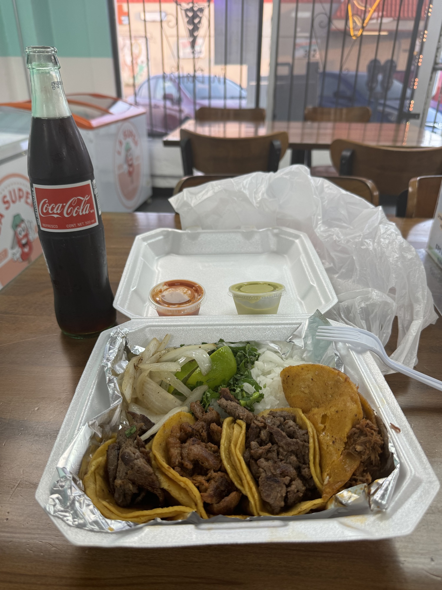 Review: Although an ice cream parlor, they do have tacos! I got four tacos; pastor, asada, fajita, and birria. They meats were solid. My favorite was the birria. Both red and green hot salsas were good! They tortillas and tacos were a bit greasy but good. The grease made the tortillas a bit soggy, so they could have used a tad more cook.