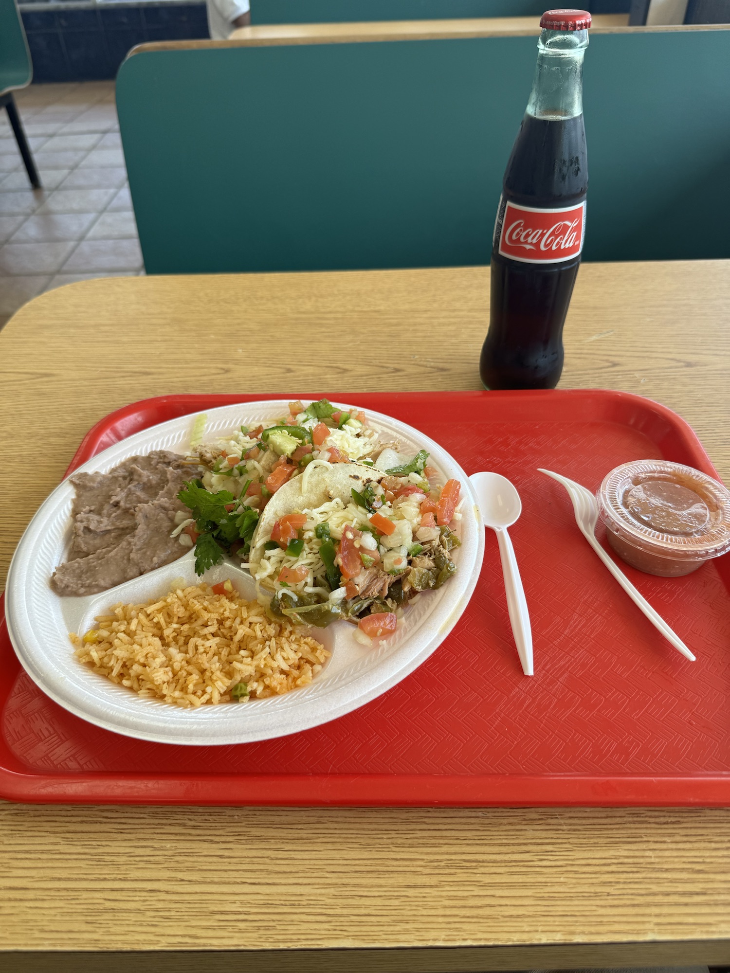 Review: I’ve driven by this place quite a bit. I have some friends who use it as a wayward finding sign for giving directions. Today I stopped in. They only have chicken so I got their chicken tacos. The chicken was solid. It has a decent flavor. It came in corn tortillas that were a little flimsy and could use more cook. On top of the chicken was a pico de gallo like salsa and cheese. They also had a chunky red salsa on the side.