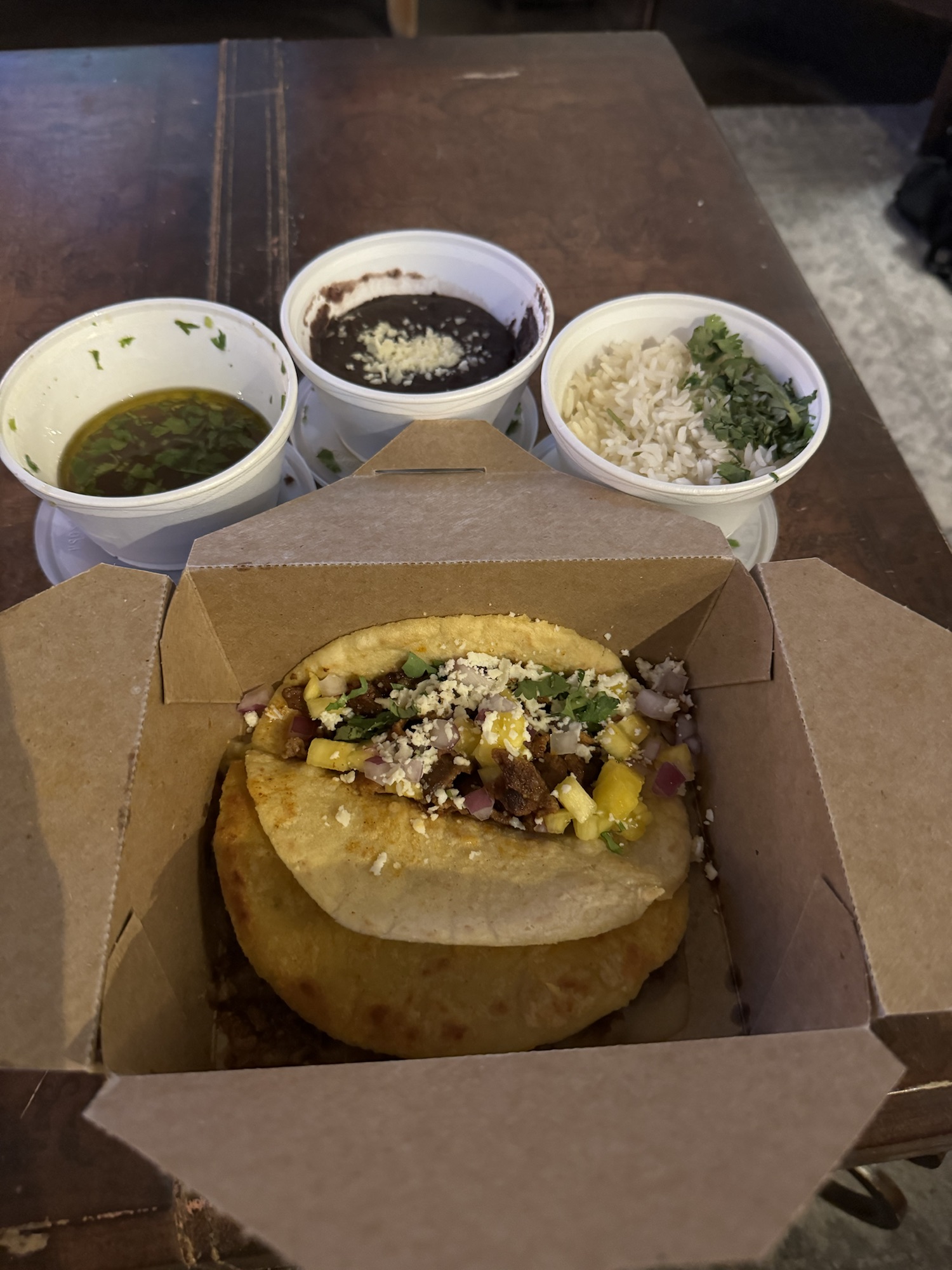 Review: I ordered on DoorDash because I was feeling lazy after doing a 10-mile run in the extreme heat. I also had a gift card that I needed to use. I know it would have been better if I got them there. I’ve visited before back in my vegan days and to get a drink, but this was my first time having meat tacos from them. I got a pastor and a birria taco. They didn’t come with any hot sauce, which bummed me out. The pastor had pineapple and cilantro, and a tiny big of cheese. They flavors were solid. I really liked the birria too. The tortilla was cooked well and had melted cheese with the meat and then the dipping sauce. It was a little greasy from the cheese, but really solid.